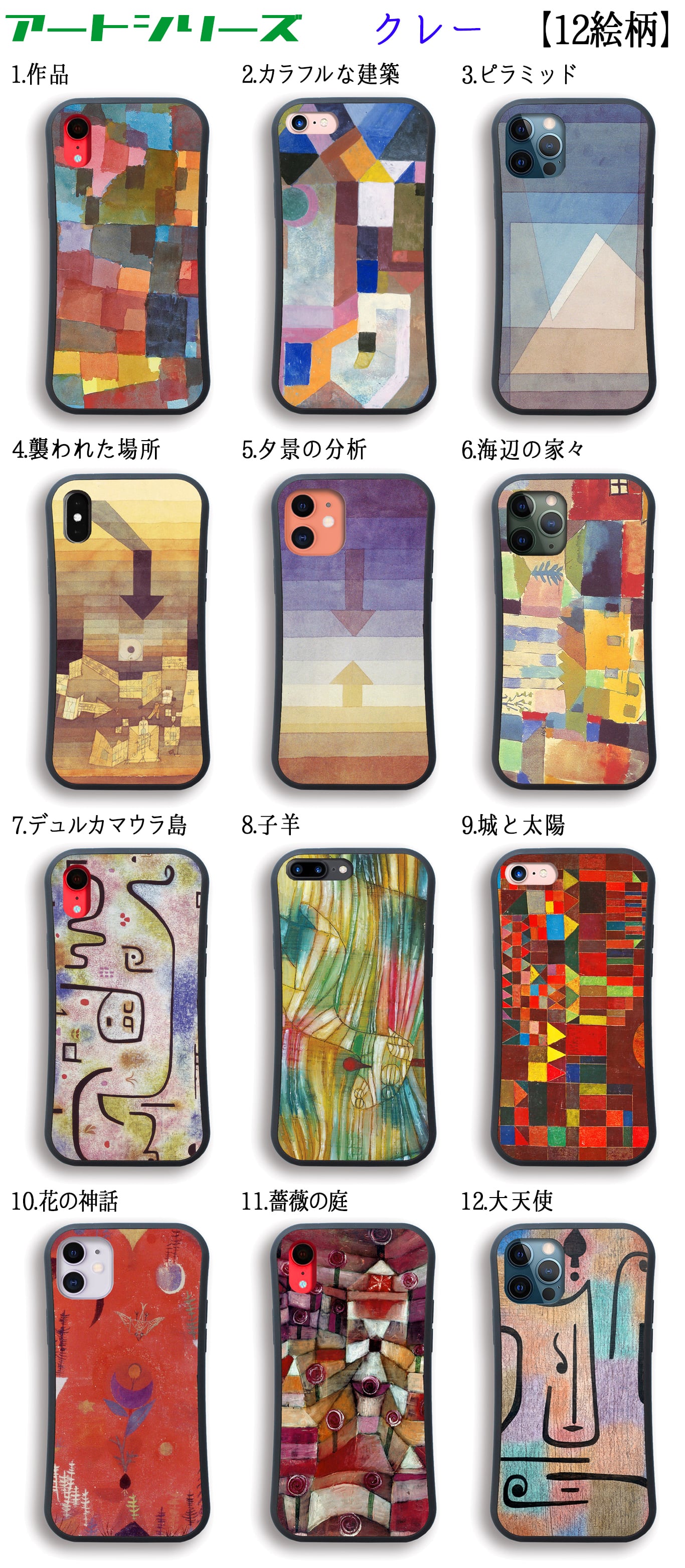 音楽にも深い理解を示し、音楽も絵画をしたと言われている。そんなクレーの代表作品「ピラミッド」「襲われた場所」「カラフルな建築」など12種類から選択!